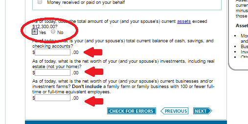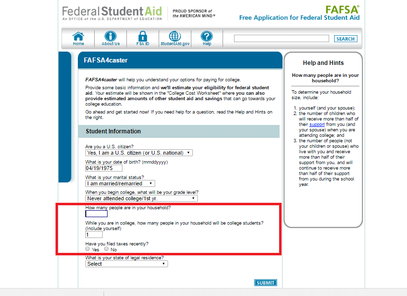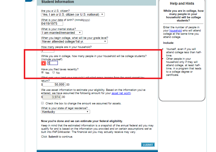 You will then answer questions about your household and the number of people in your household who will also be going to college. Be sure to put at least a one in there!