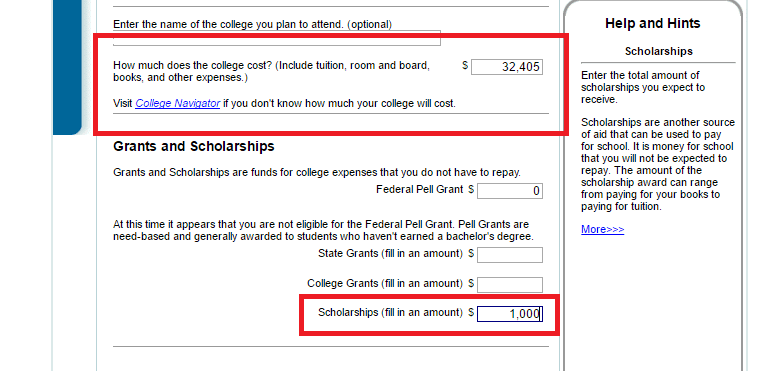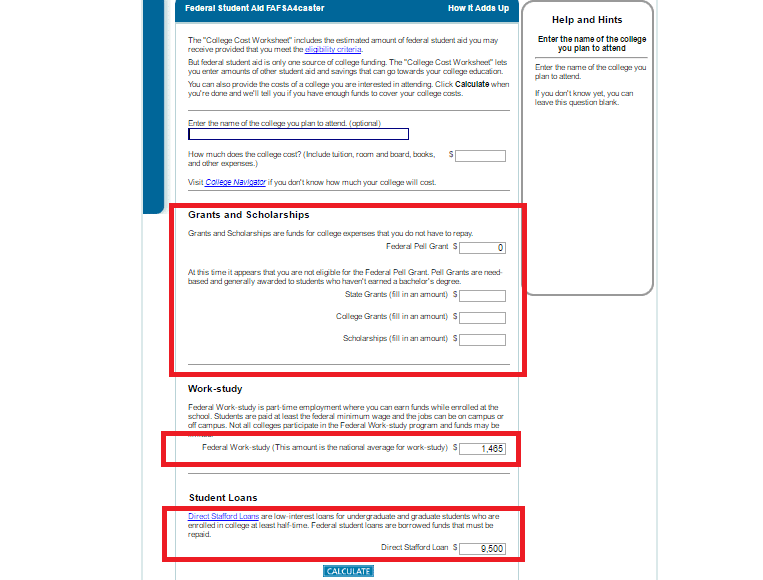 Here's a look at what the page looks like on the whole. Note all four categories are represented and that the calculator is already accounting for Direct Stafford Loans (low interest loans you receive as long as you're enrolled in school half time) and Work-study funds: