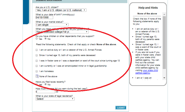 If you have no children or dependents, you will be prompted with a series of boxes that will help you determine your dependency status.