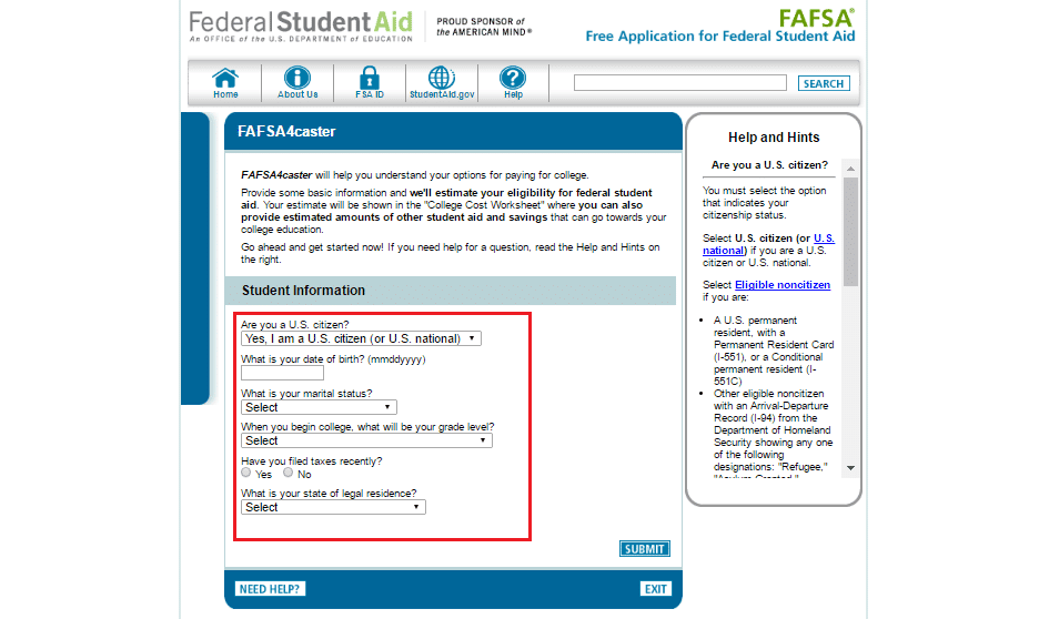 Once there, click the pull down menu indicating your citizenship status, which will initiate another series of necessary information including you DOB, marital status, grade level, tax update, and state of legal residence. Also, take note of the helpful box that follows you and answers your questions!